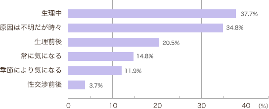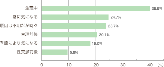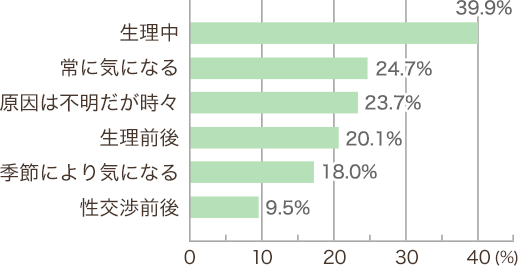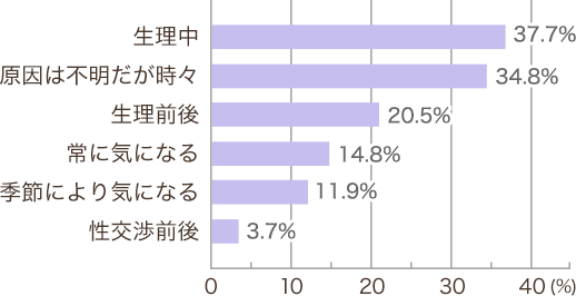 やはり1番悩みが増えるのは「生理中」。経血の独特のニオイと蒸れやすい状態がかゆみを引き起こしやすいため、お悩みを自覚しやすいタイミングです。デリケートなこの時期は、石けんで洗い過ぎてかゆみがひどくなるなどトラブルも増えやすいので要注意。次いで「原因は不明だが時々...」と日常でお悩みを抱えてる女子も多いことがわかります。
