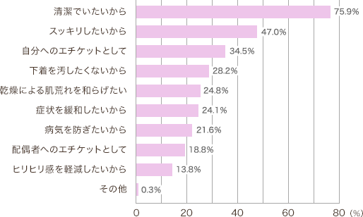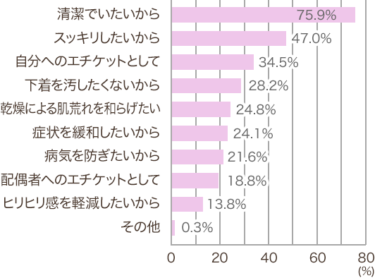「清潔でいたいから」がダントツ。デリケートゾーンを清潔に保つことは大変と感じている人が多いようですね。それもそのはず。尿やオリモノの雑菌が繁殖しがちなデリケートゾーンを清潔に保つには専用のケアが大切なんです。もちろんデリケートな部分だから、一般的なボディーソープで洗うと刺激が強すぎてバランスがくずれてしまうので専用ケアがオススメです。