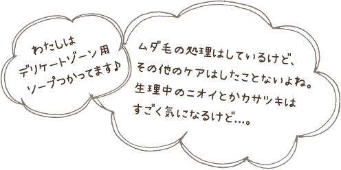 - ・生理中は必ずかぶれちゃう。普通の石けんだと痛くて洗えなくて困る。