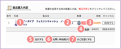 数量を変更する場合は[買い物かご画面]の修正ボタンを